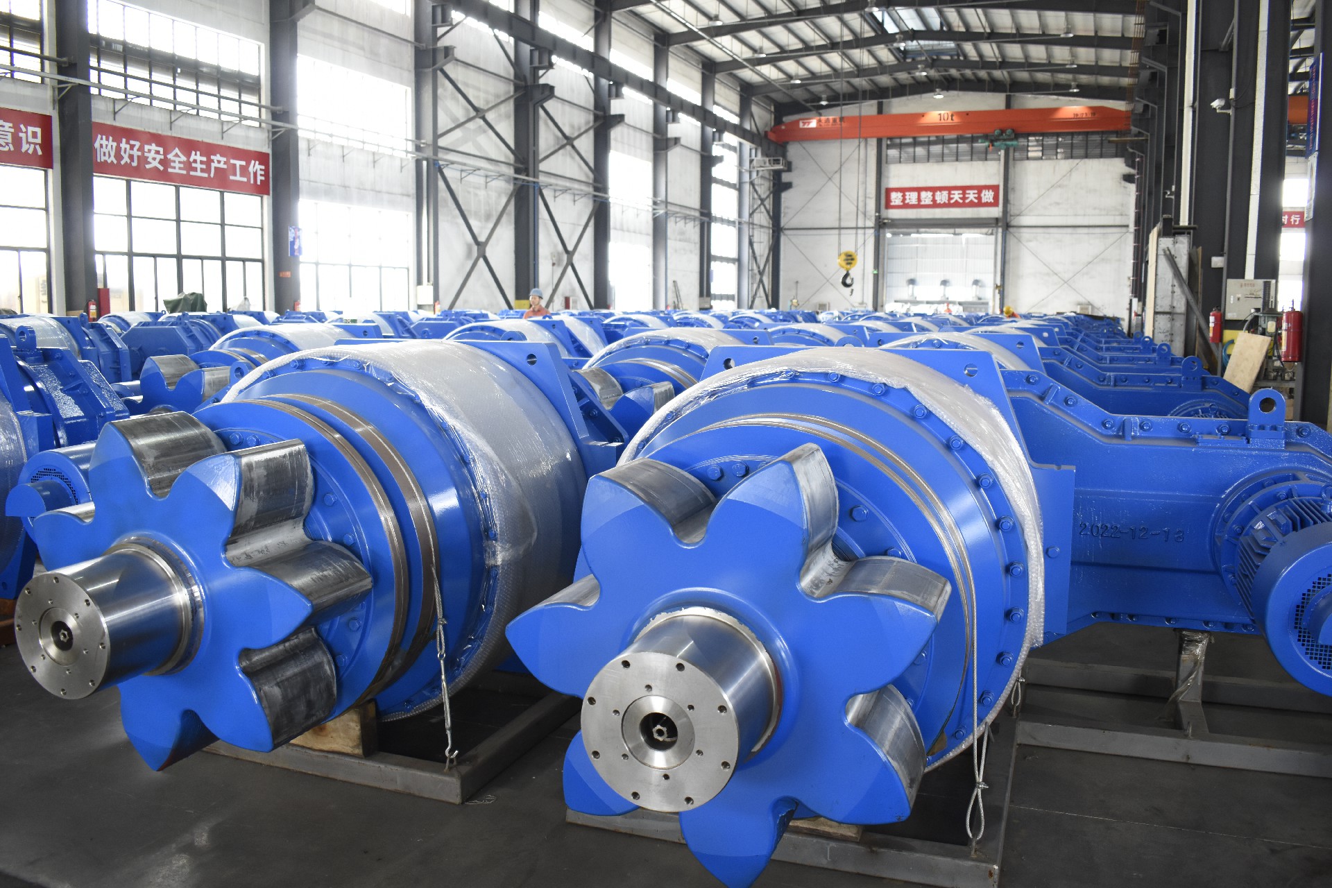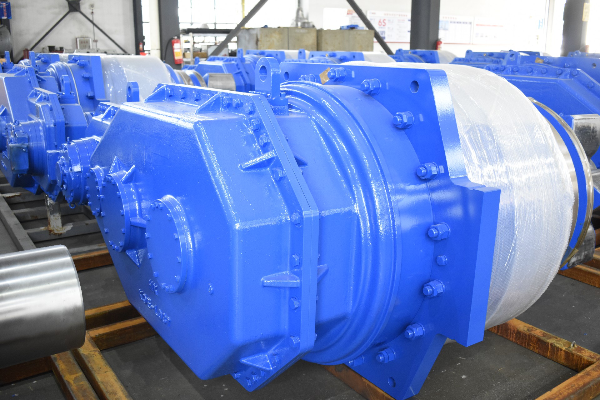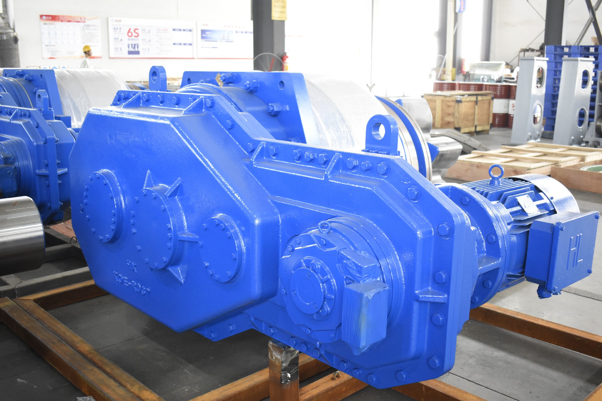 一套齒輪齒條升降系統(tǒng)一般由多個升降單元及電氣控制系統(tǒng)構成,升降單元數(shù)量根據(jù)平臺所要求的舉升能力和平臺總體要求加以確定。升降單元由行星減速箱、平行減速箱、爬升齒輪、電機、制動器等部件組成。動力通過馬達驅動齒輪減速箱,傳遞給與樁腿齒條嚙合的爬升齒輪帶動平臺完成升降。按照驅動方式,齒輪升降系統(tǒng)分為電機驅動齒輪齒條式和液壓驅動齒輪齒條式。